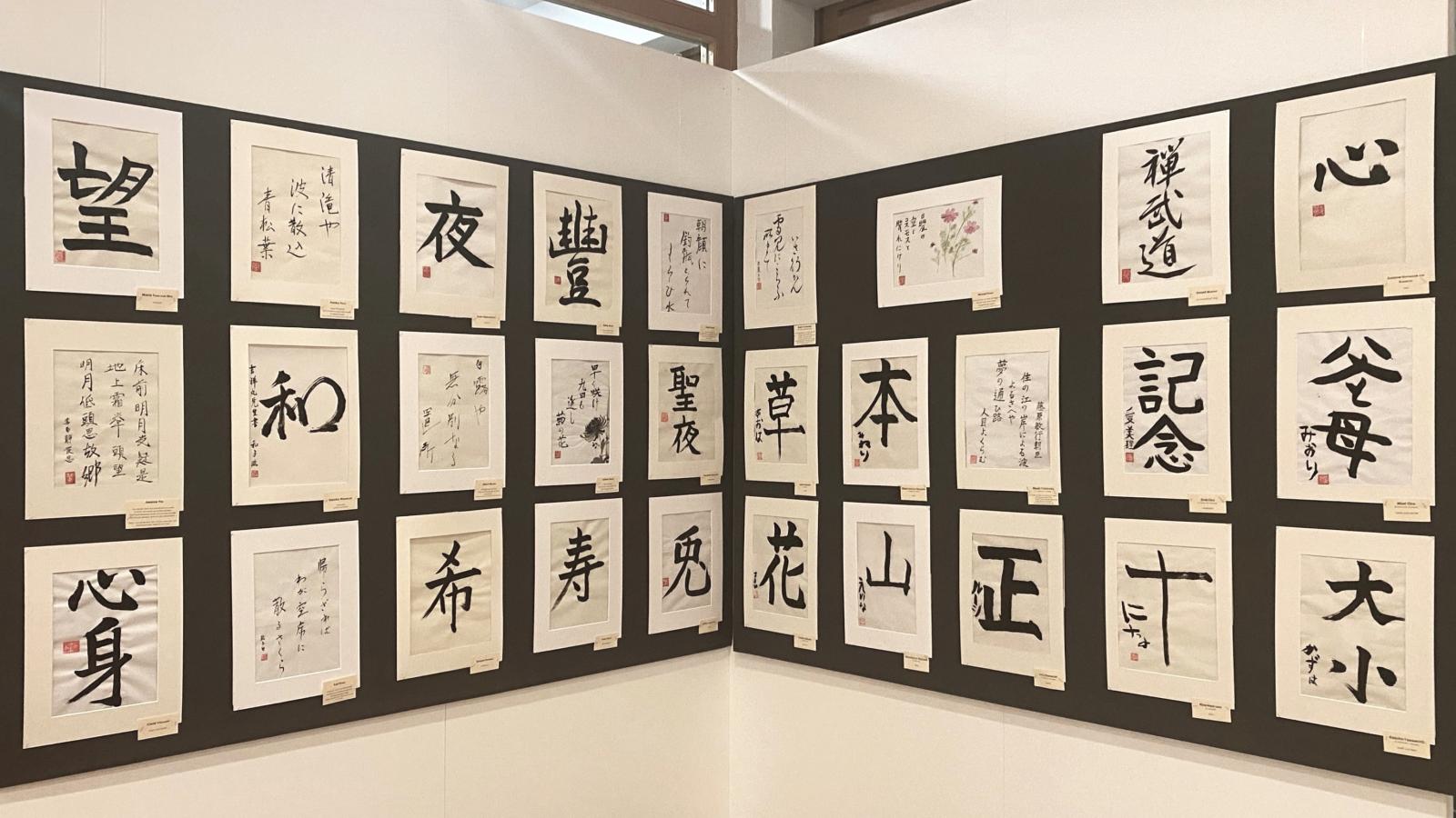 本書道展では、ベルリン日独センター書道講座の受講生の作品を中心に展示しています。皆川彩雨講師(社会人向け講座及びオンライン講座)と梅坂今子講師(児童向け講座)の指導のもと、受講生は漢字の様々な書体を学び、文字を美しく書く筆遣いを練習します。