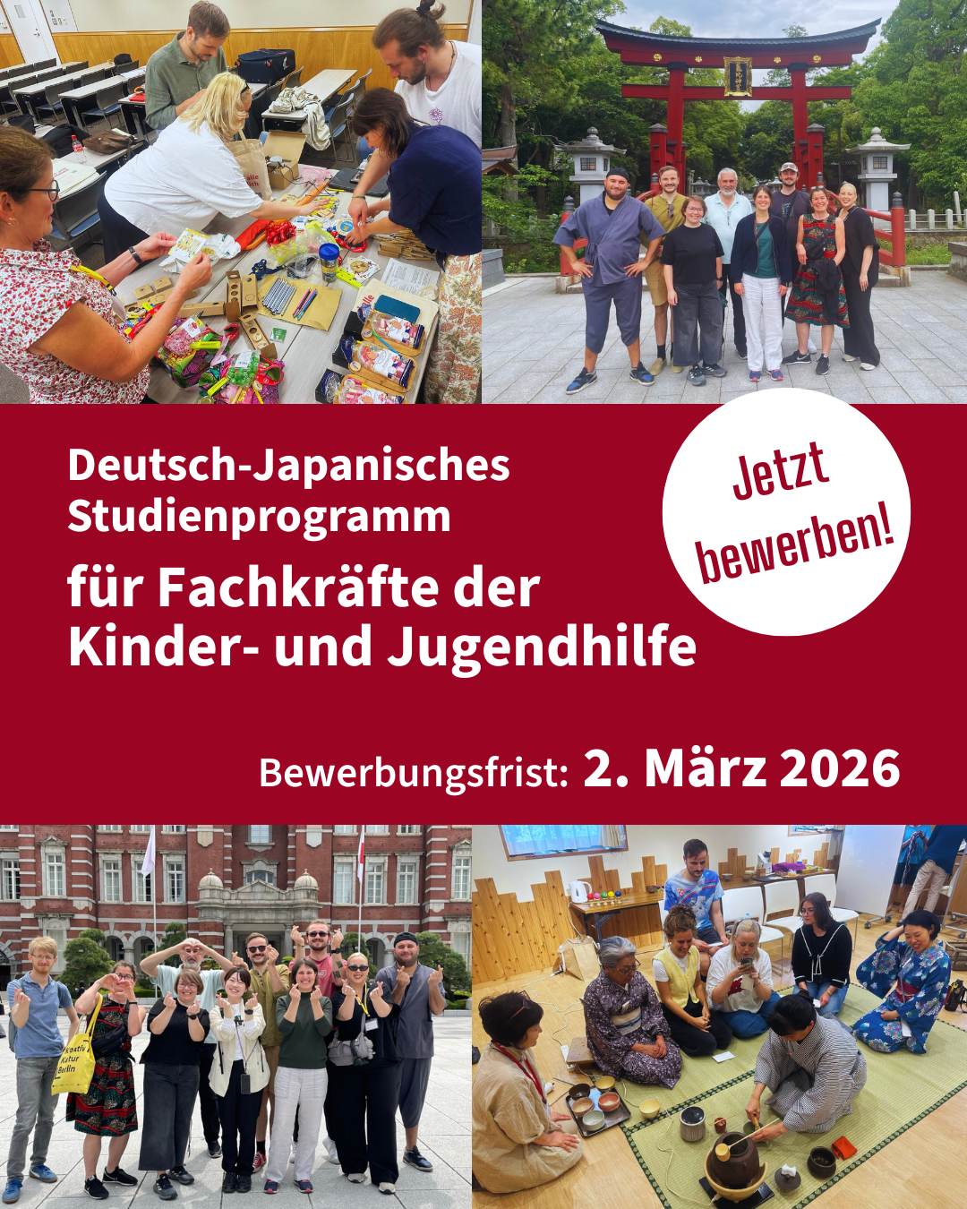 共通テーマ「社会におけるすべての若者の平等な参加とエンパワーメント」の下、ベルリン日独センターが担当する重点テーマ「子どもと若者の貧困防止ー貧困に苦しむ子どもと若者の社会的統合」の訪日研修プログラムに参加するドイツ代表団メンバーを募集中です。2週間にわたる日本滞在中(5月24日~6月7日)、ドイツ代表団は日本の関連施設を訪れ、現場を視察し、専門家と意見交換する機会を得ます。